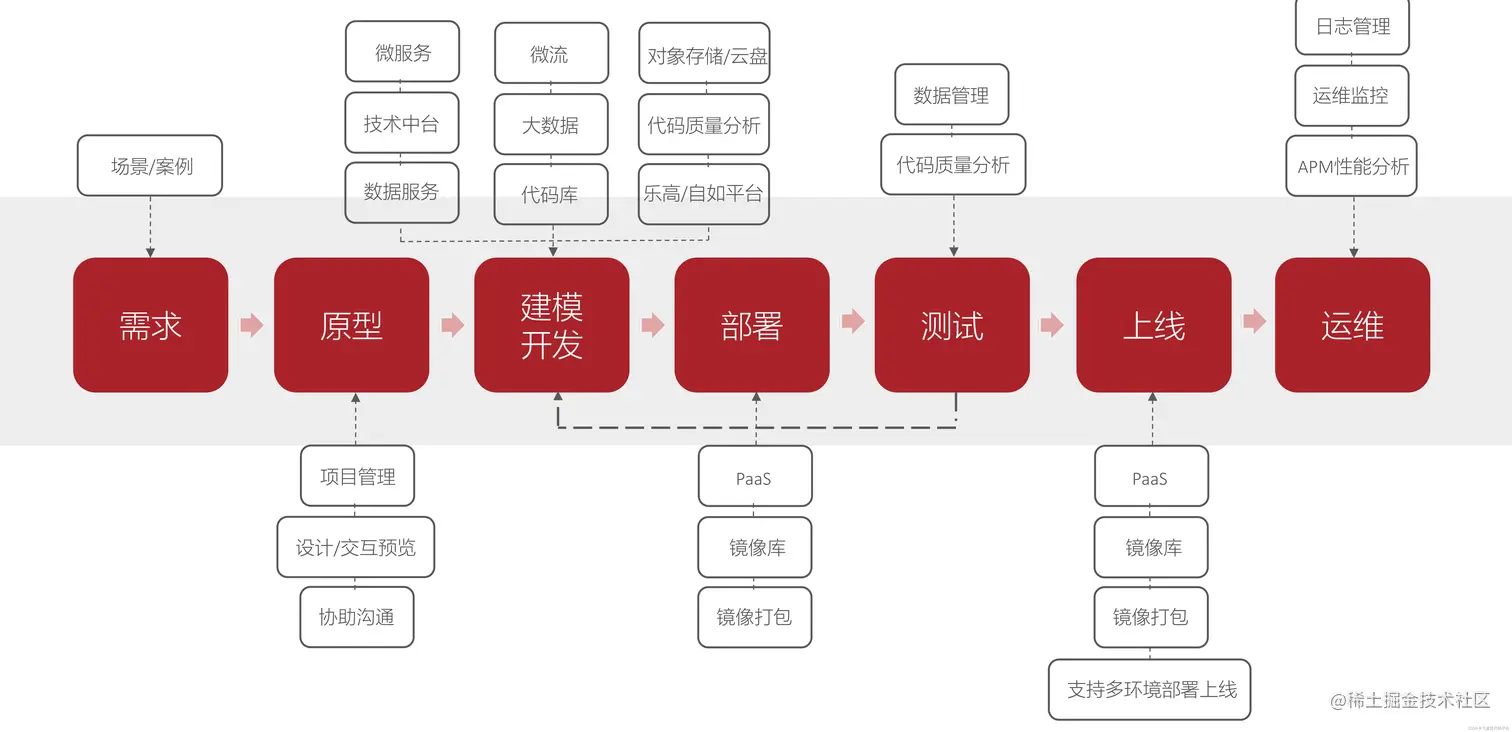 提供整个开发全过程各环节工具,包括原型、建模开发、测试部署、发布流水线、运维监测等。
