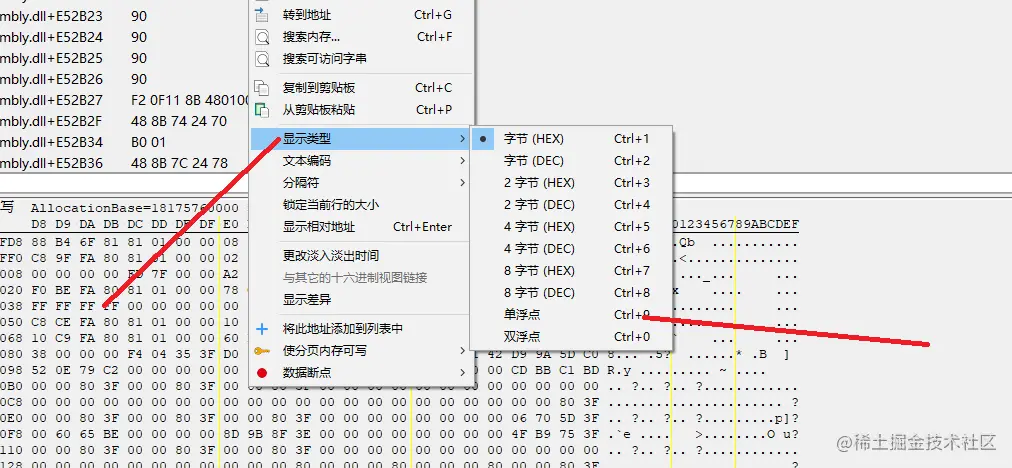 同样的,我们依旧是要找到子弹后座力的地址,子弹后座力有很多的保存形式,比如射击的次数,比如一个浮点数的大小--我的子弹扩散的半径,比如离屏幕准心的2个偏移,既然这么多形式我们该如何下手呢,这时候我们先前找到的子弹地址就排上用场了。不妨假设我们武器相关的数据都在一个对象中,那么就有可能他们在内存是一段连续的区域中。根据我们的假设我们要查看子弹地址的内存区域。点击我们的子弹地址,右键点击浏览相关内存区域,然后开几枪试试