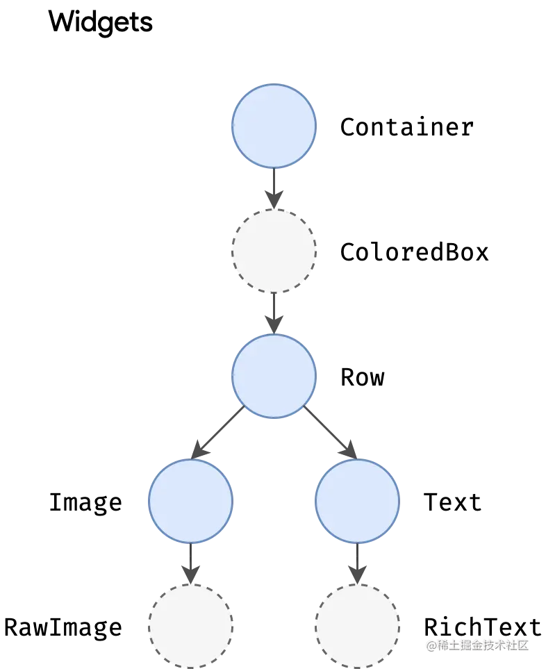 为什么是Widget集合呢?在上面我们也分析过,Container这个widget是由很多个其他的widget组成的,所以,上面的Container会生成下面的widget树: