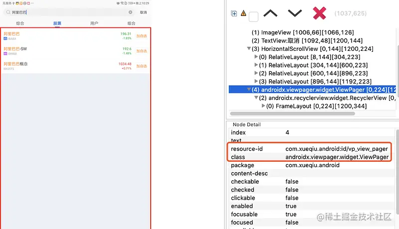 在“股票”和“用户”tag页中,“加自选”和“关注”控件的clickable及id属性一样。\