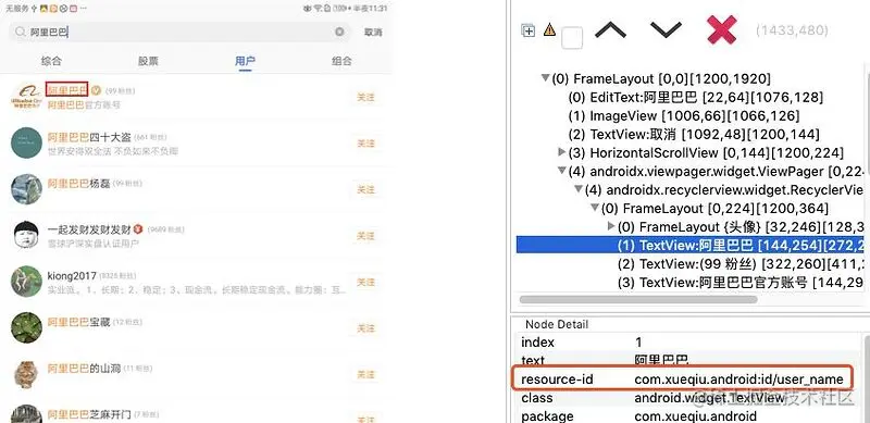 2)接着我们就必须从 tag 页内部来找标志控件了,我们发现在“股票”和“用户”页中搜索出来的结果名称的 id 是不同的: