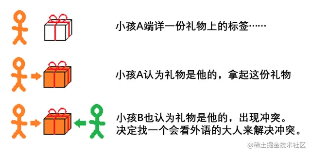 所以对并行系统来说,系统不认识这些“标记”没关系,只要有标记就行。如果发现两个孩子争夺同一份礼物,就可以找认识标记的人来解决冲突。