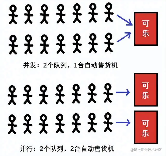 - “并行”意味着可乐分发速度更快;