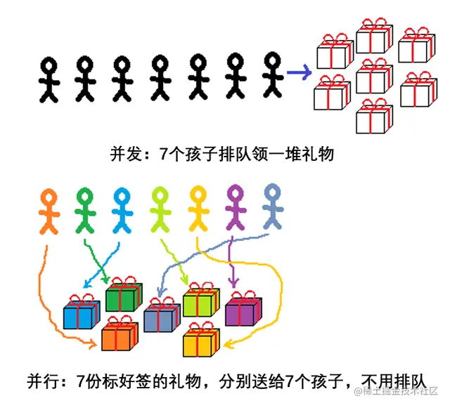 在分礼物的场景中,“并发”与“并行”有不同的意义: