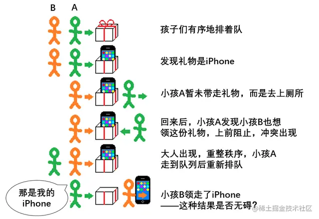 但纵观全程,小孩A先拆开了礼物,但又中途离开队列,回来后发现礼物被后面的小孩B领了——这种结果符合系统的要求吗?一方面,小孩B没有插队,也没有阻挠小孩A领礼物,并未违反系统规则;但另一方面,小孩B领到本属于小孩A的礼物,这并不符合系统的预设。