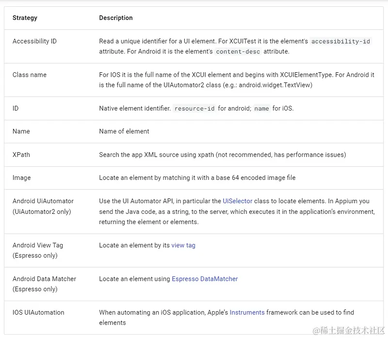 定位页面的元素有很多方式,比如可以通过 ID、accessibility_id、XPath 等方式进行元素定位,还可以使用 Android、iOS 工作引擎里面提供的定位方式。