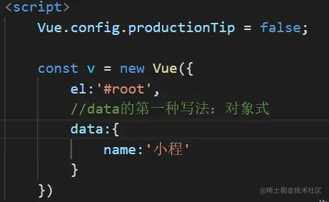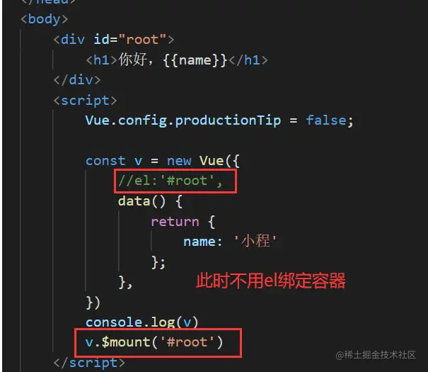 (2)先创建vue实例,随后再通过vm.$mount('#root')指向el的值