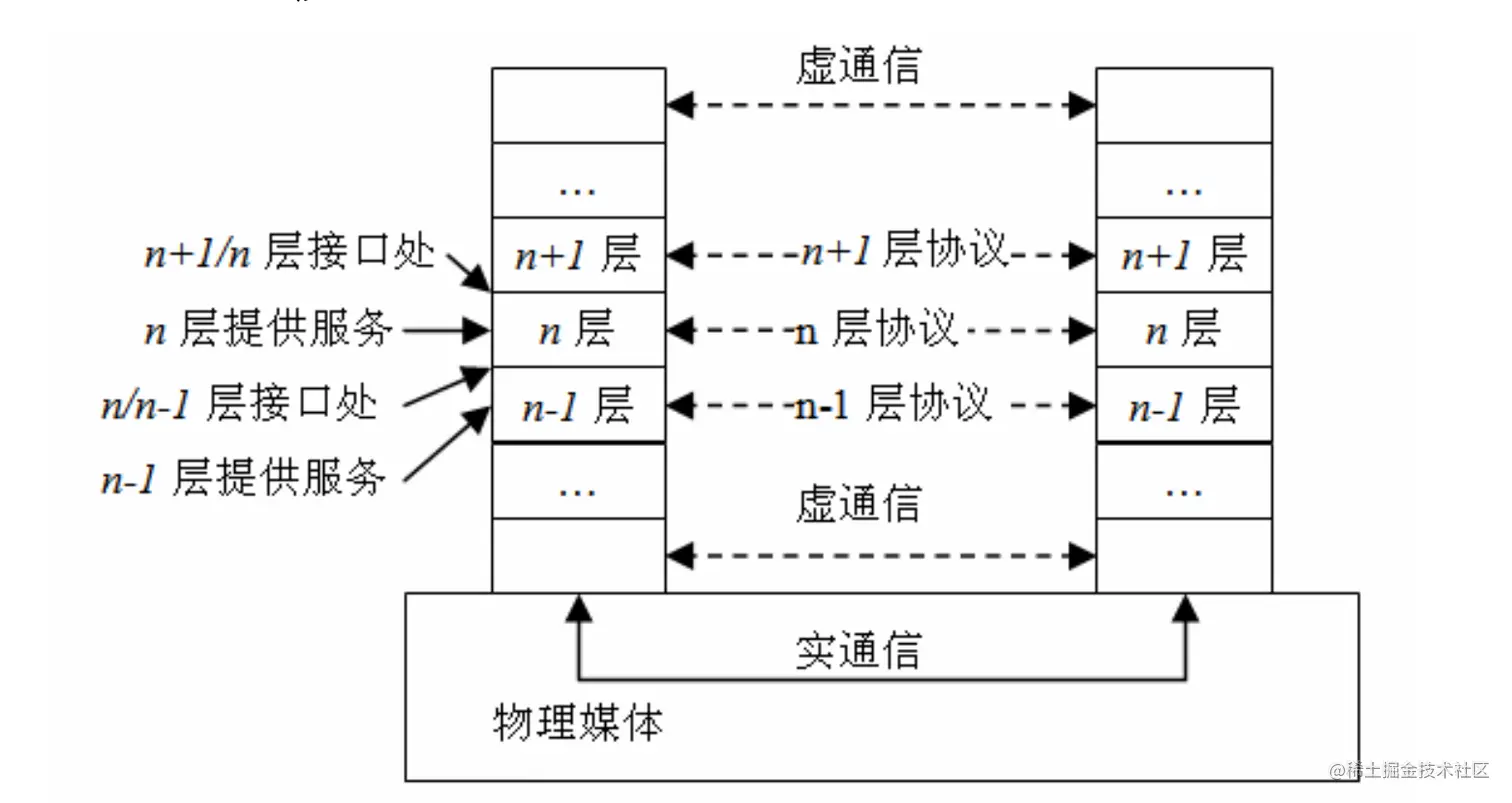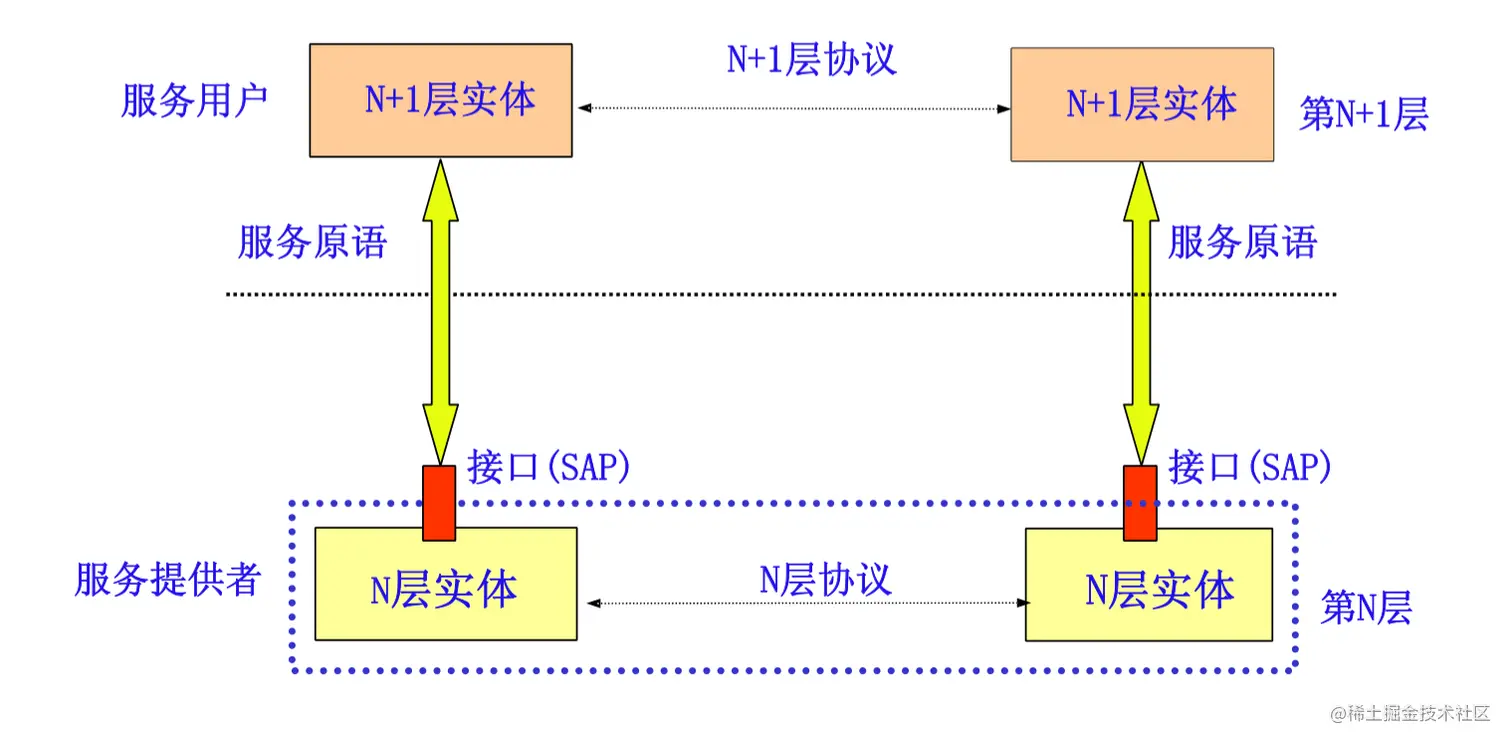 服务:每一层为相邻的上一次提供的功能称为服务、第N层向第N+1层提供服务,第N层的实体则为服务提供者;第N+1层使用第N层提供的服务,第N+1层的实体为第N层的服务用户。下层提供的服务,对上层完全透明。