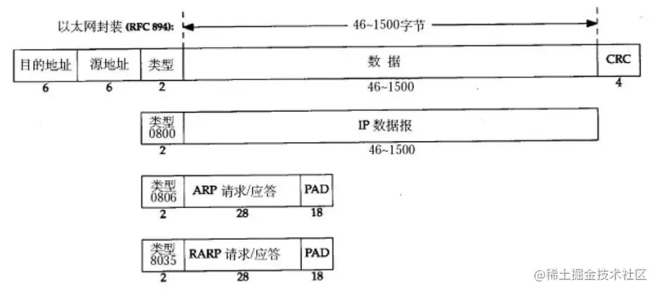 Preamble 前导码,序言:7byte或56bits的长度,为交替的0和1,来进行时钟同步。 Start frame delimiter (SFD)帧开始符号: 该符号 (1 byte: 10101011)表示了下面就是数据了,不能继续用来时钟同步了。10101011与preamble的1结尾相连接,形成2个1作为标志。 Destination address 和source address 就是源mac和目的mac地址 Type类型: 此字段定义包封装在其中的上层协议的框架。该协议可以是IP、ARP、OSPF等。 Data:数据来源于上一层,大小应在46到1500byte之间,如果小于46,则会自动补0,反之需要分割 CRC错误检测:检测源和目的mac地址与数据的和,如果发现错误,则该帧丢弃。