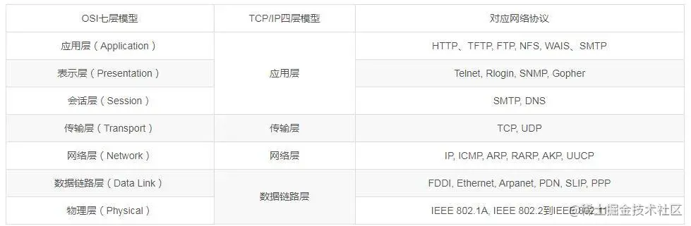 应用层 DHCP · DNS · FTP · Gopher ·GTP · HTTP · IMAP4 · IRC · NNTP · NTP · POP3 · RPC · RTCP · RTP ·RTSP · SIP · SMTP ·SNMP · SSH · SDP · SOAP .STUN. SSDP · TELNET · XMPP 表示层 HTTP/HTML · FTP · Telnet · ASN.1(具有表示层功能) 会话层 ADSP ·ASP ·H.245·ISO-SP ·iSNS ·NetBIOS ·PAP ·RPC· RTCP ·SMPP ·SCP ·SSH ·ZIP ·SDP(具有会话层功能) 传输层 TCP · UDP · TLS · DCCP · SCTP ·RSVP · PPTP 网络层 IP (IPv4 · IPv6) · ICMP · ICMPv6 · IGMP ·IS-IS · IPsec · BGP · RIP · OSPF ·ARP · RARP 数据链路层 Wi-Fi(IEEE 802.11) · WiMAX(IEEE 802.16) ·ATM · DTM · 令牌环 · 以太网路 · FDDI · 帧中继 · GPRS · EVDO · HSPA · HDLC · PPP · L2TP · ISDN ·STP 物理层 以太网路卡 · 调制解调器 · 电力线通信(PLC) · SONET/SDH(光同步数字传输网) · G.709(光传输网络) · 光导纤维 · 同轴电缆 · 双绞线
