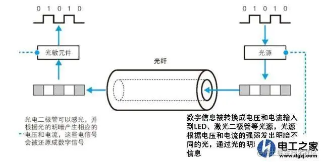 生活中,我们使用手电筒时,可以通过明暗的变化传递信息,光纤传输信息跟这个差不多。 在网络世界里,只有0和1,数字信号不能直接变成光信号,需要将数字信号转换成电信号,比如1用高压表示,0用低压表示。将这些电信号输入到激光、二极管等光源,光源根据信号电压变化而发光,比如高电压发光亮,低电压发光暗。 光信号到达对端时,通过光敏元件根据光的亮度产生不同的电压,转换成电信号,最后将电信号转换成数字信号,这样我们就收到信号了。