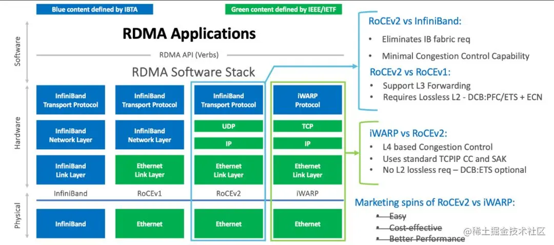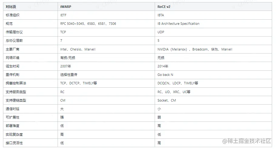 在以太网环境,主要可选项为RoCE v2和iWARP,相关对比如下: