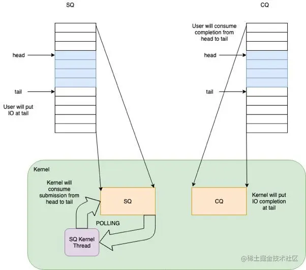 - CQ:内核生产,然后通知(若用户程序睡眠等待则唤醒)用户态消费。其中元素称为CQE。