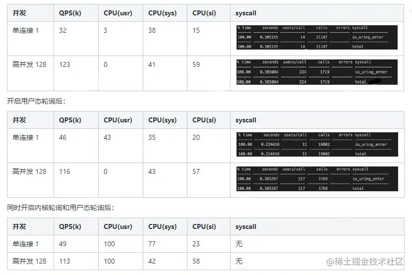 - io_uring即使开启内核轮询,在负载低时可降低延时,而满载性能提升不明显,反而浪费了CPU资源。