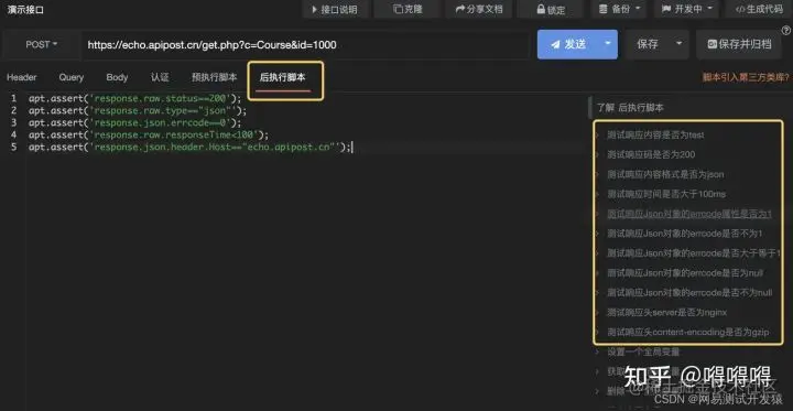 除了查看结果外,ApiPost也提供了强大的测试校验功能。在这里我们也可以使用断言来进行响应结果的校验