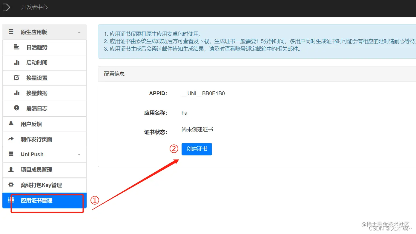 点击刚刚创建的应用名称=>点击应用证书管理=>点击创建证书=>创建完成后,下载证书。点击证书详情,查看证书别名、Android 证书签名SHA1、密钥。