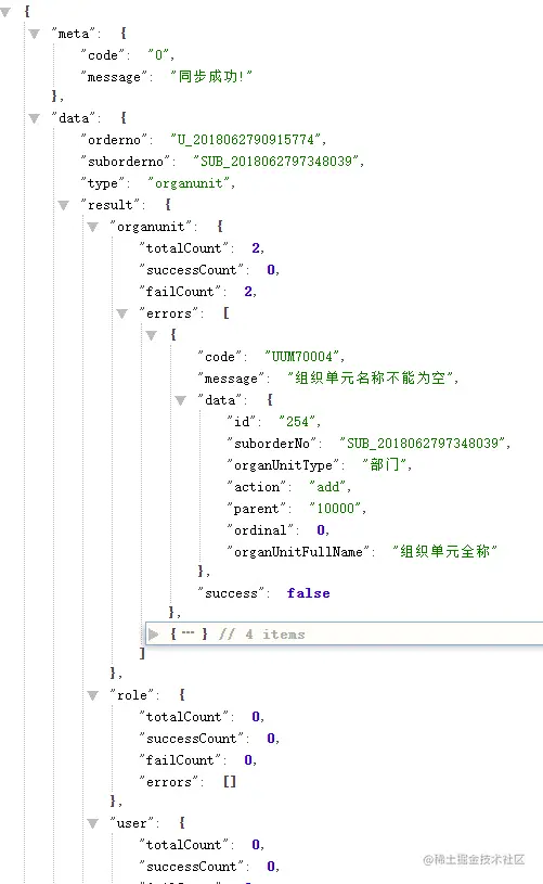 String str ="{\"meta\":{\"code\":\"0\",\"message\":\"同步成功!\"},\"data\":{\"orderno\":\"U_2018062790915774\",\"suborderno\":\"SUB_2018062797348039\",\"type\":\"organunit\",\"result\":{\"organunit\":{\"totalCount\":2,\"successCount\":0,\"failCount\":2,\"errors\":[{\"code\":\"UUM70004\",\"message\":\"组织单元名称不能为空\",\"data\":{\"id\":\"254\",\"suborderNo\":\"SUB_2018062797348039\",\"organUnitType\":\"部门\",\"action\":\"add\",\"parent\":\"10000\",\"ordinal\":0,\"organUnitFullName\":\"组织单元全称\"},\"success\":false},{\"code\":\"UUM70004\",\"message\":\"组织单元名称不能为空\",\"data\":{\"id\":\"255\",\"suborderNo\":\"SUB_2018062797348039\",\"organUnitType\":\"部门\",\"action\":\"add\",\"parent\":\"10000\",\"ordinal\":0,\"organUnitFullName\":\"组织单元全称\"},\"success\":false}]},\"role\":{\"totalCount\":0,\"successCount\":0,\"failCount\":0,\"errors\":[]},\"user\":{\"totalCount\":0,\"successCount\":0,\"failCount\":0,\"errors\":[]}}}}";