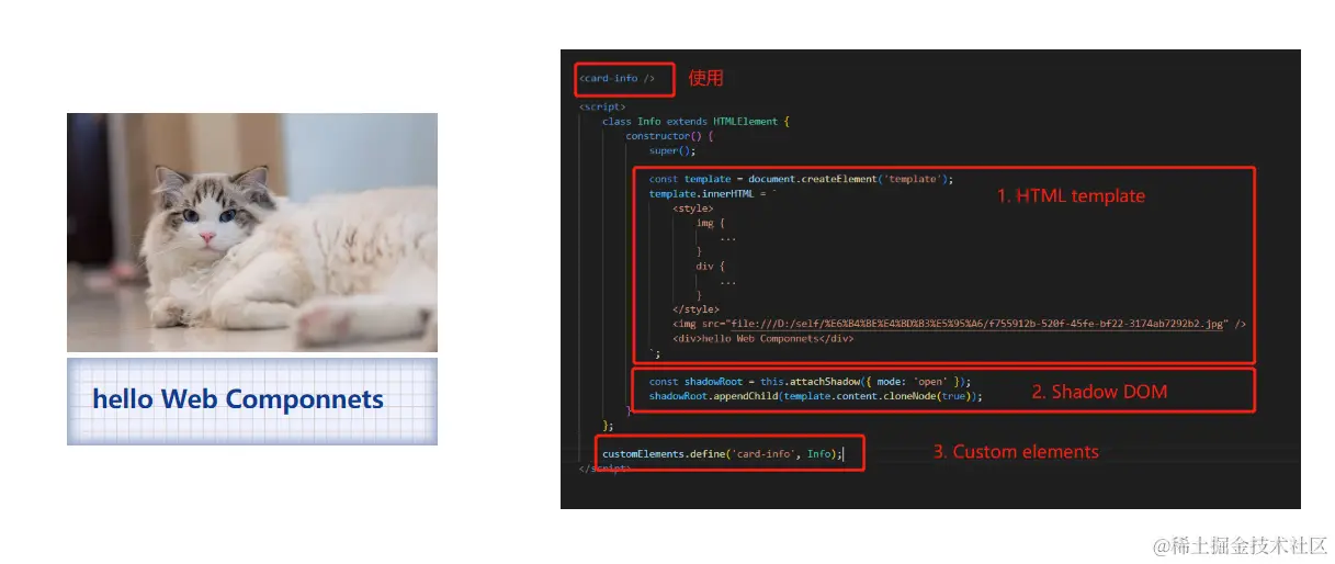 没错,这么几行代码已经涵盖了 Web Componnet 中的三项技术,以下是 MDN 对这三部分内容的介绍🎈