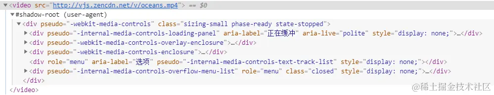 从图中可以看到,一个拥有进度条、开始、暂停等丰富功能的 video 标签,原来是一堆基础标签拼出来的。并且可以选中 video 标签,在控制台执行 $0.querySelector('.closed');返回结果是 null, 这就是 shadow DOM 的魅力,天然沙盒。