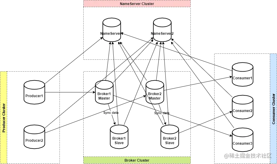 NameServer 通常以集群的方式部署,各实例间相互不进行信息通讯,只是互为备份,达到高可用的效果。RocketMQ 典型的双主双从部署方式如下图所示: