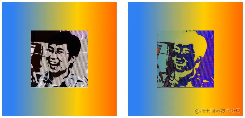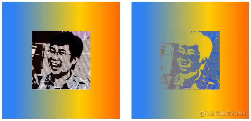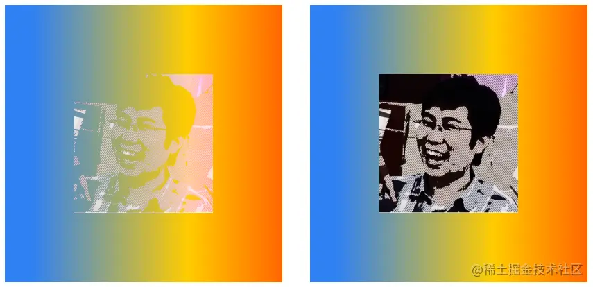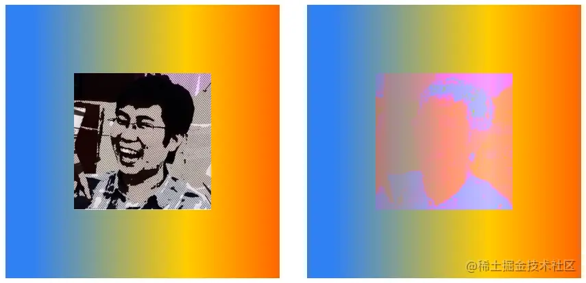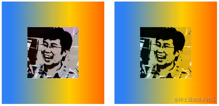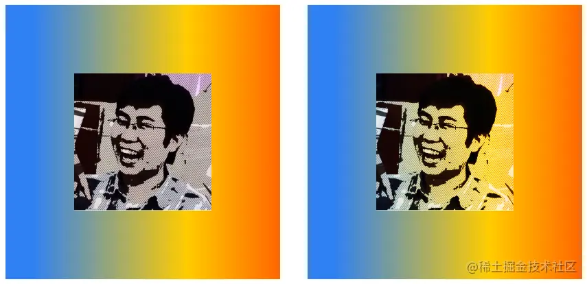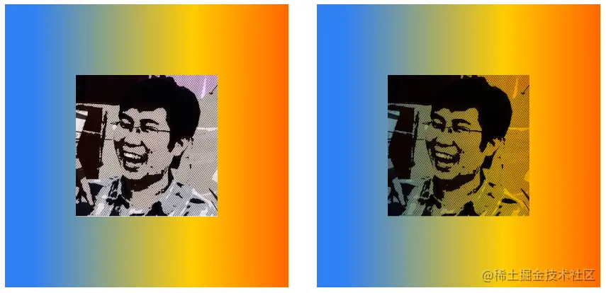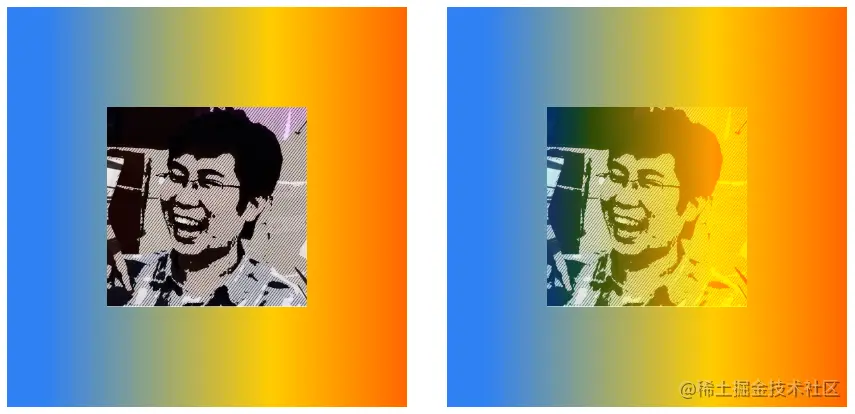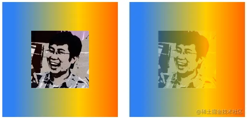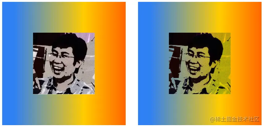 下面将img元素的mix-blend-mode属性定义为darken,父元素div声明了渐变背景。在下图中,左侧是img和div默认的混合效果,右侧是使用了darken混合后的效果。