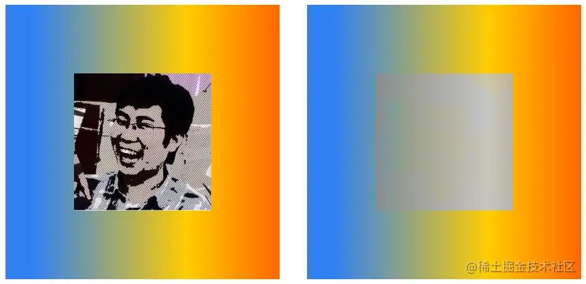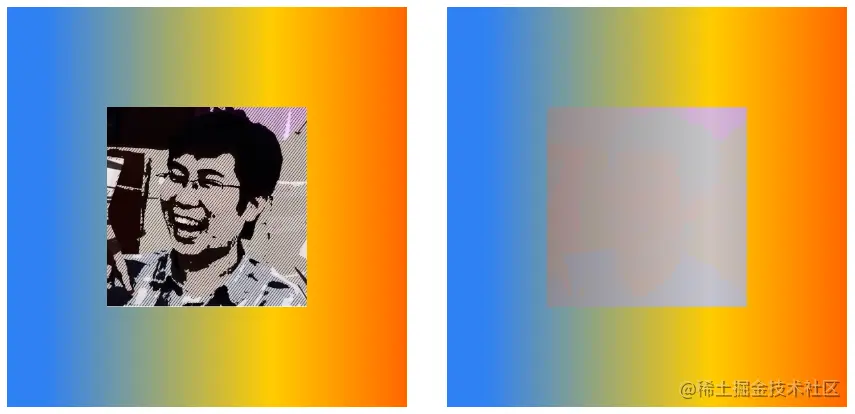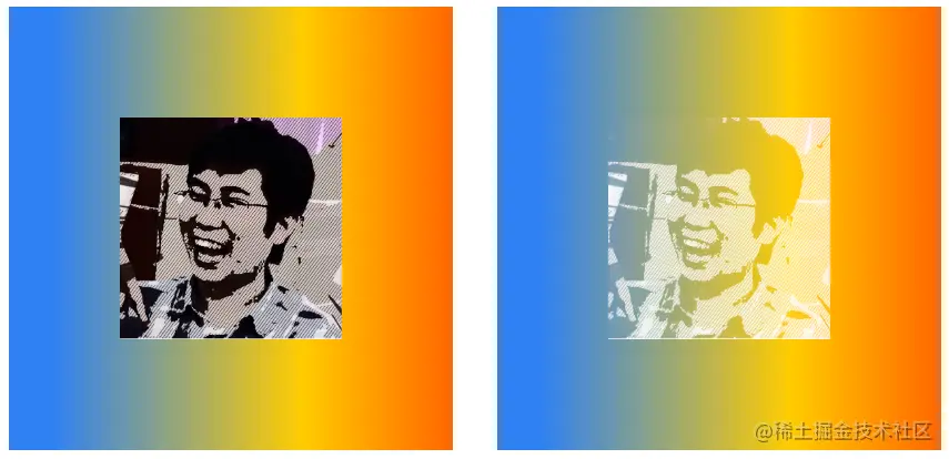 在下面的示例中,包含两个div元素,都使用lighten混合,其中第二个div元素包含背景色。两个元素的混合效果如下图所示,左侧无背景色,右侧有背景色。