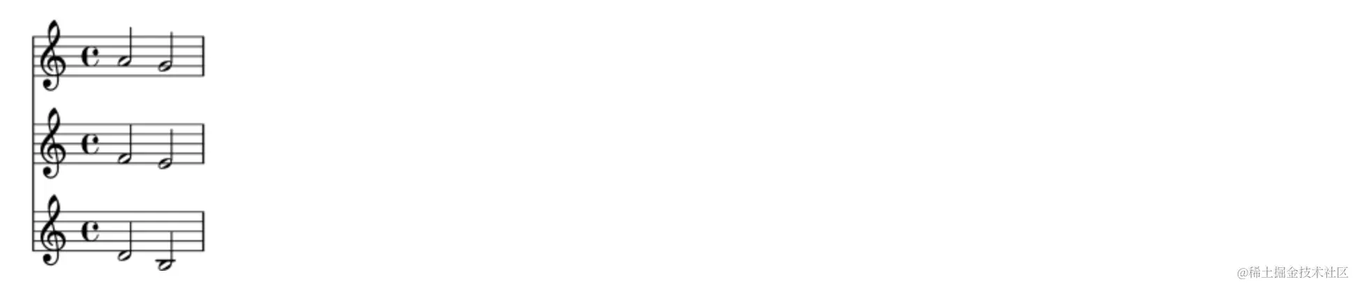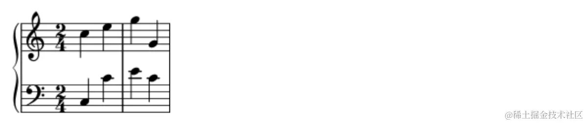 当我们需要输入多个同时演奏的声部时,我们可以使用 <<<多条五线谱 >>>的格式来输入音乐表达式。