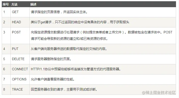HTTP1.1新增了五种请求方法:OPTIONS, PUT, DELETE, TRACE 和 CONNECT 方法。