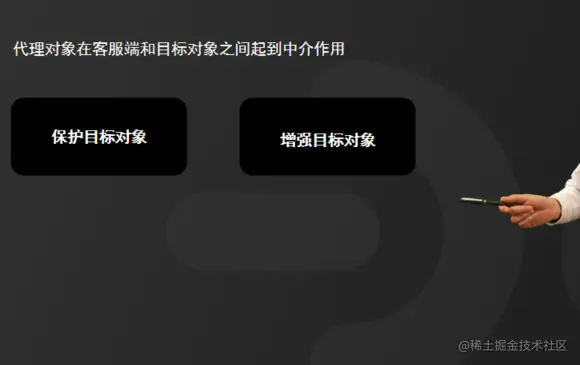 大致意思是,为其他对象提供一种代理项或占位符,以控制对这个对象的访问。什么意思呢?代理模式最核心的思想是创建一个代理对象作为在客户端和目标对象之间中介。主要目的是保护目标对象和增强目标对象。