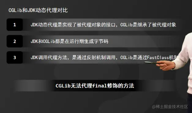 目前,主流动态代理API有两种,分别是JDK Proxy和CGLib,CGLib的实现原理我就不详细赘述了,如果想详细了解的小伙伴可以在评论区回复666,我可以单独再拍一期视频详细介绍。好了,最后,还是给大家介绍一下CBLib和JDK Proxy的区别。