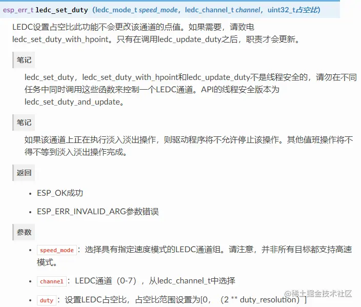 ledc_channel_config()Section Channel Configuration中的Covered。传递给函数的占空比值的范围取决于选择的值,