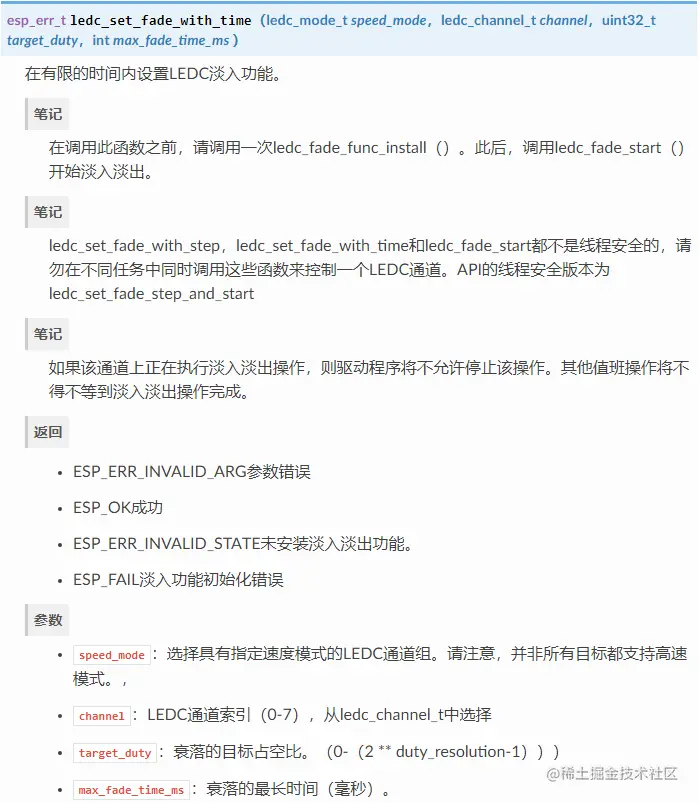 有关速度模式的更多详细信息,请参阅《ESP32技术参考手册》 >“ LED PWM控制器(LEDC) [ PDF ]”。请注意,SLOW_CLOCKLEDC驱动程序尚不支持本手册中提到的支持。