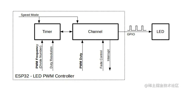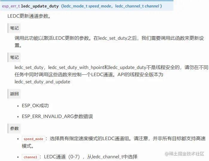 高速模式可以无故障地切换计时器设置。这意味着如果修改了计时器设置,则更改将自动应用到计时器的下一个溢出中断。相反,在更新低速计时器时,设置的更改应由软件明确触发。LEDC驱动程序在后台处理它,例如,当ledc_timer_config()或被ledc_timer_set()调用时。