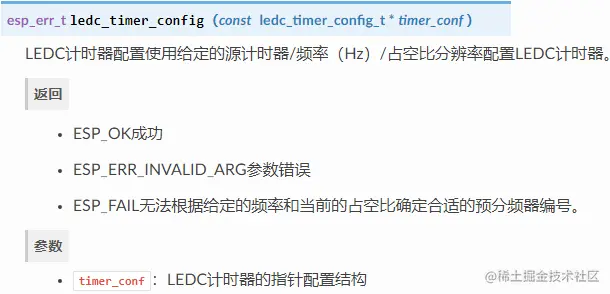 通过调用函数ledc_timer_config()并传递ledc_timer_config_t包含以下配置设置的数据结构来完成定时器的设置: