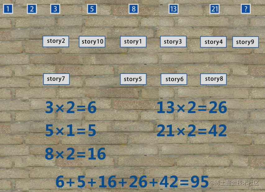接下来就要计算每一列的story个数,并且乘以所在列值,从而得到所有的故事点,如下图所示:通过敏捷-快速估算方法最后得出的结果是95,其中不包括story9工作量。
