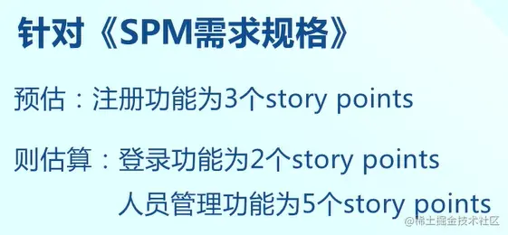 采取SPM项目为例,其中注册功能预估值为3个Story point,而登录功能比注册功能的工作量略少,所以估计值为2个Story point,而人员管理功能比注册功能略多,所以估计值为5个Story point。