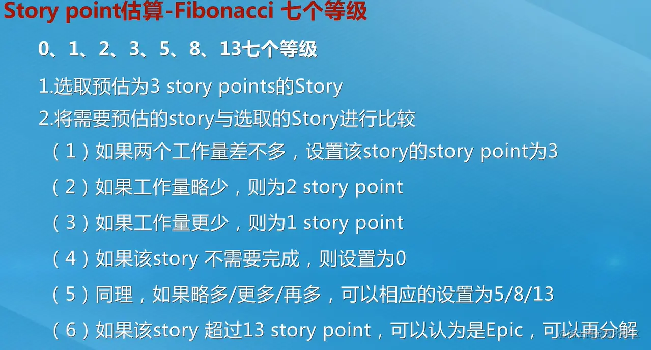 Story point概念为:即故事点,用来度量实现一个Story需要付出的工作量的相对估算。