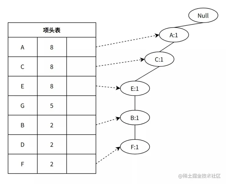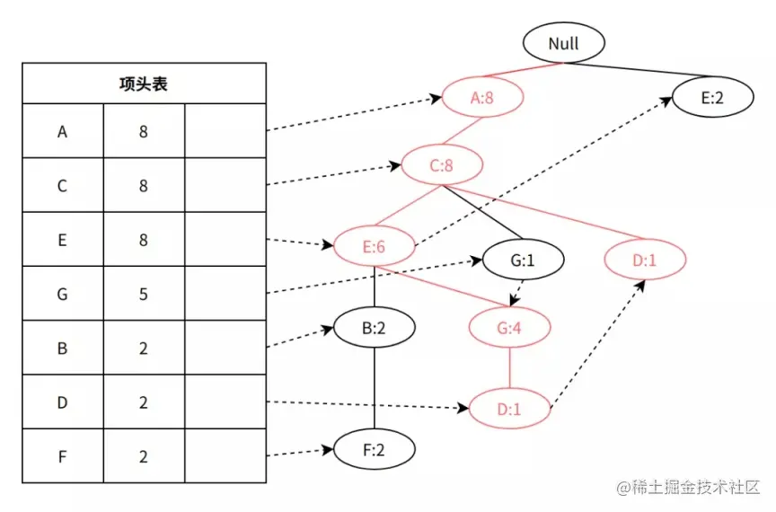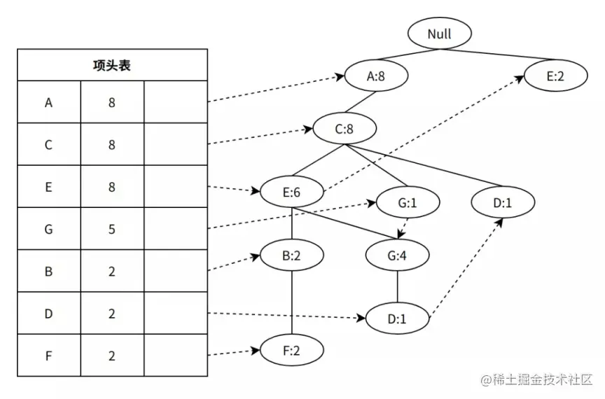 重复上述步骤,直到扫描完成所有项集,可得如下结果,其中部分项无法仅用一个节点表示,比如 G,在项集 2 和 5 中,项集分别为[A、C、G]和[A、C、E、G、D],因此需要采用链表链接两个节点: