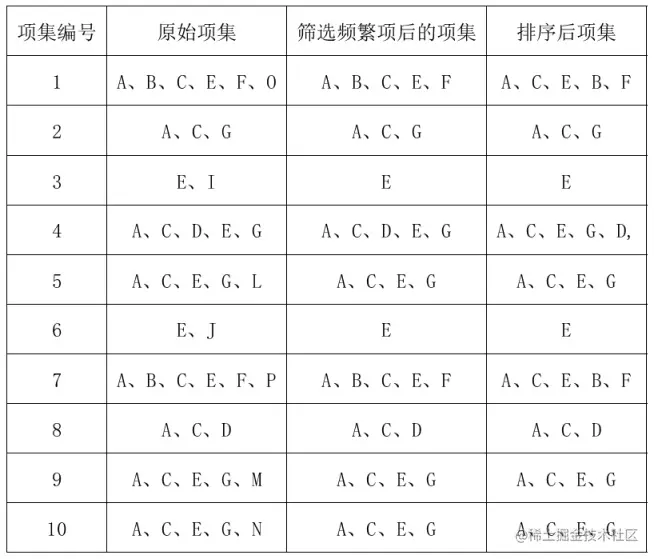 FP-Growth 算法最初的步骤与 Apriori 算法相似,但为了更加直观的展示这一过程,我们将从如下的示例数据入手: