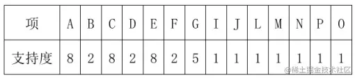 统计原始数据中各项的支持度,为了更加直观的展示实际效果,我们将项一共出现在了几个项集中作为该项的支持度,比如对于项“A”,在项集 1、2、4、5、7、8、9、10 中都出现过,共出现在了 8 个项集中,则 A 的支持度为 8,其余各项的支持度如下。