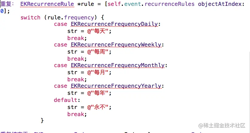 重复结束于:用属性EKRecurrenceEnd表示。EKRecurrenceEnd*recurrenceEnd =rule.recurrenceEnd;