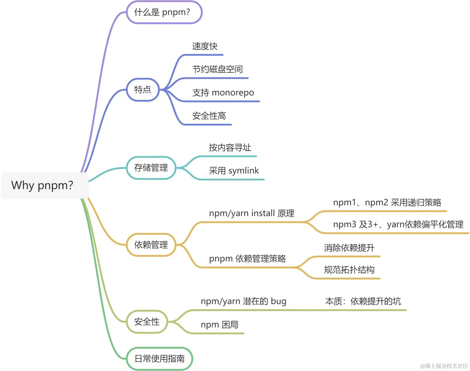 pnpm 是由 npm/yarn 衍生而来,但是却解决了 npm/yarn 内部潜在的 bug,并且极大地优化了性能,扩展使用场景。下面是思维导图: