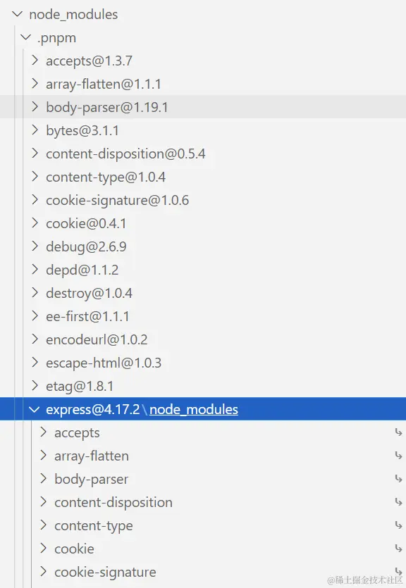 好像也都是一样的规律,都是@version/node_modules/这种目录结构。并且 express 的依赖都在.pnpm/express@4.17.2/node_modules下面,这些依赖也全都是软链接。