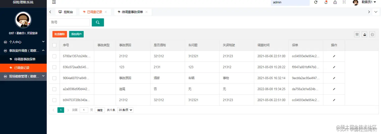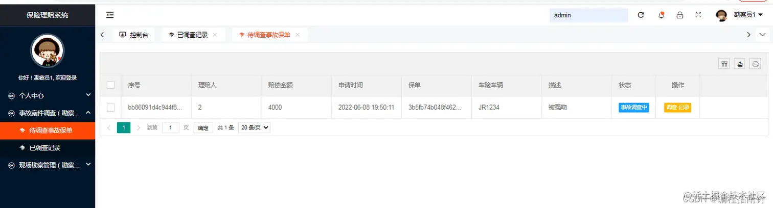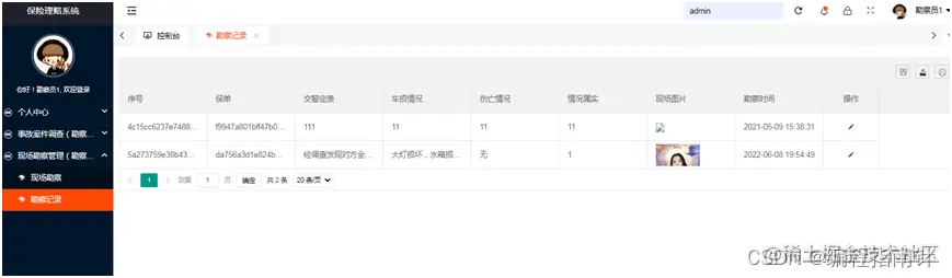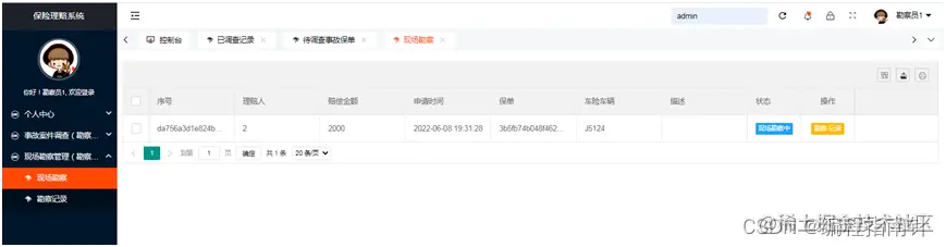 本系统基于Springboot开发实现了一个为用户车险进行理赔信息管理的一个信息化管理系统,核心的业务主要是用户申请保险理赔,管理员审核进入理赔程序,事故调查员对事故进行调查和现场勘察,这其中共涉及到三类用户,购买保险的客户,事故调查员和系统管理员。