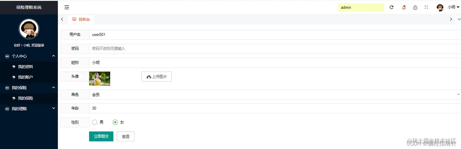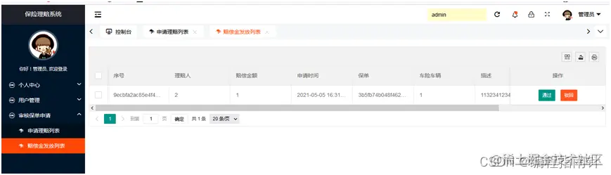 管理员功能:个人资料管理,用户管理,理赔审请审核,赔偿金发放管理