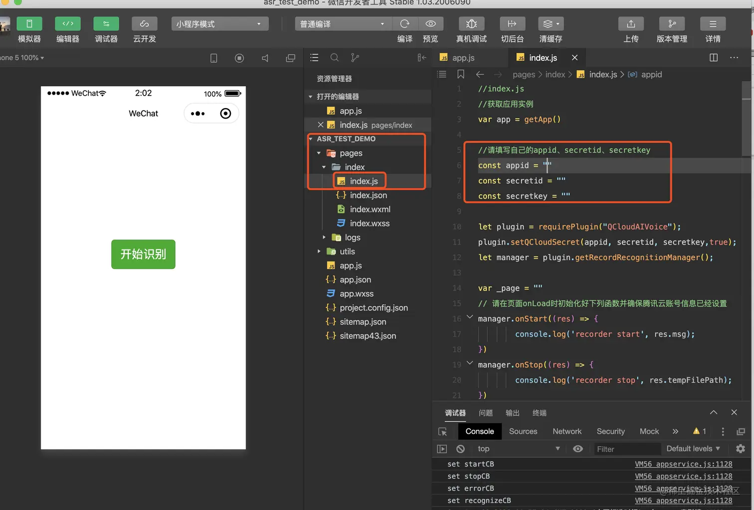 打开导入程序的index.js文件,然后把2.1步骤获取的AppId、SecretId、SecretKey分别复制到截图中的参数里。