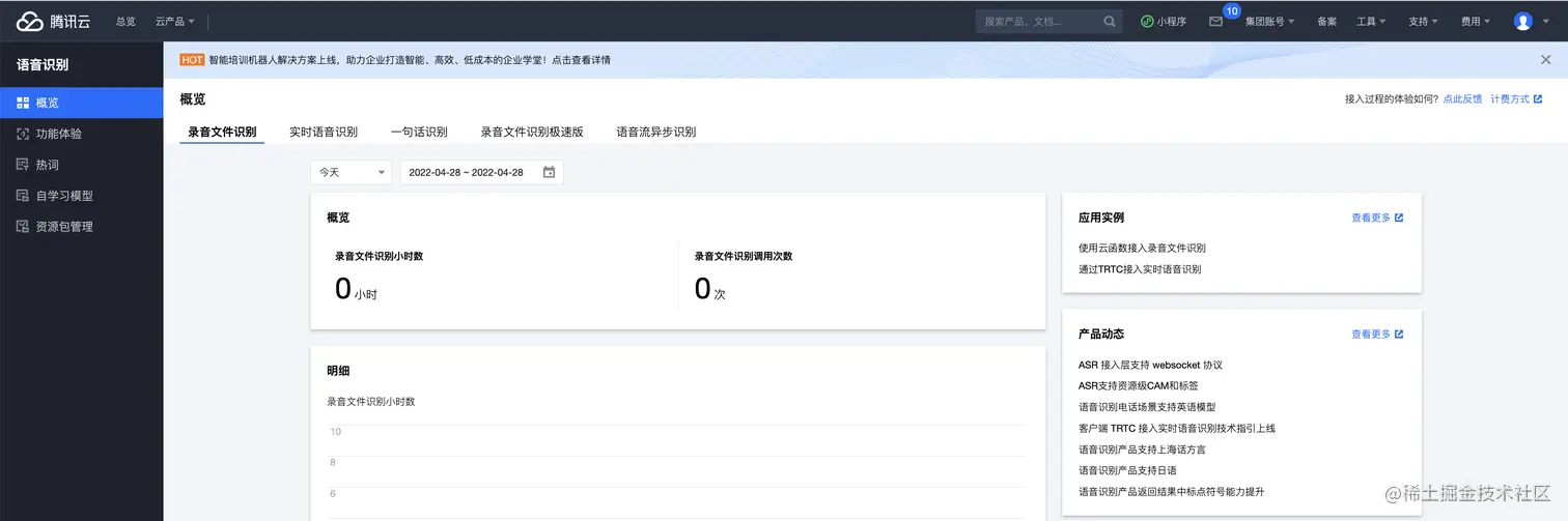 使用了服务,怎么看服务调用量呢,可以进入 腾讯云语音识别控制台 ,点击概览就可以看到整体的调用量了。
