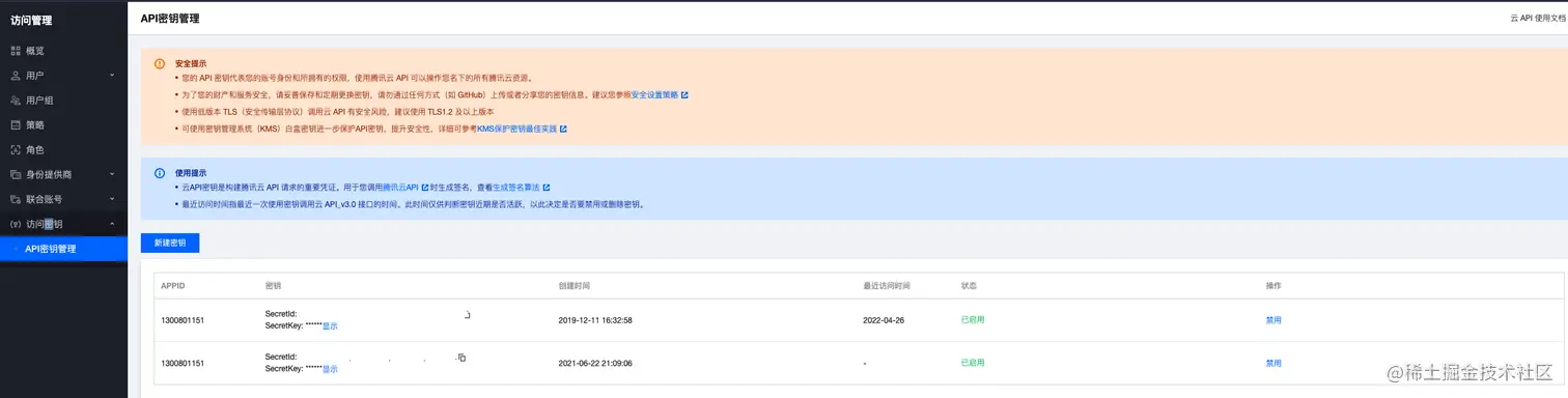 访问腾讯云的服务,都需要一个秘钥,在腾讯云访问管理的API密钥管理页面,可以新建一个秘钥,这个可一定要保管好,不能泄露出去,不然就被别人盗用了。秘钥后面我们要用到。