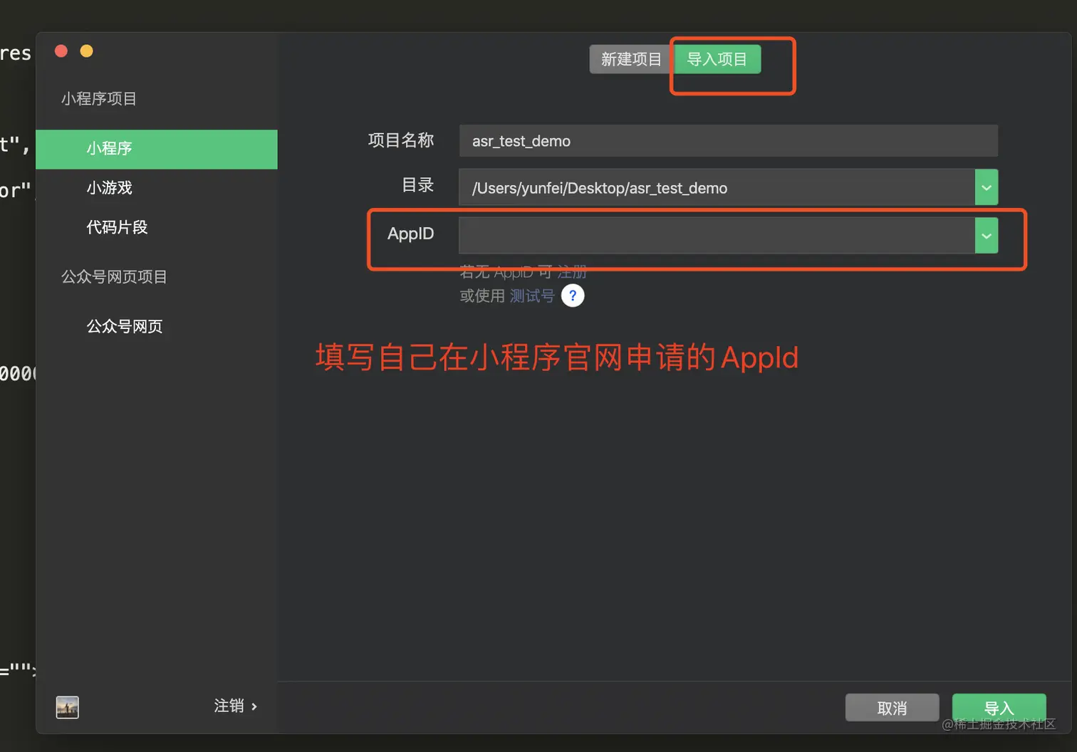 3. 导入Demo,在目录选择解压的demo地址,并且填入小程序官网申请的AppId