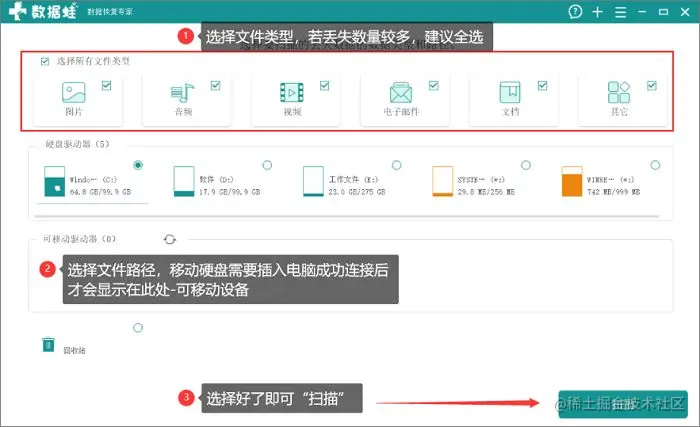 主要步骤:打开电脑内的数据蛙数据恢复专家,来到软件首页界面后,选择丢失的文件类型(如果丢失的文件数量较多,建议全部选择,避免遗漏),再选择文件丢失的路径(对应本文主题选择移动硬盘,也可以实际为准)。两个重要的部分选择完成后点击“扫描”;